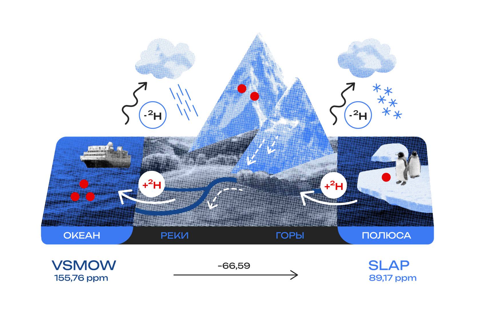 При каждом испарении уровень дейтерия постепенно снижается, поэтому на пути от океана до полюсов вода очищается практически вдвое.